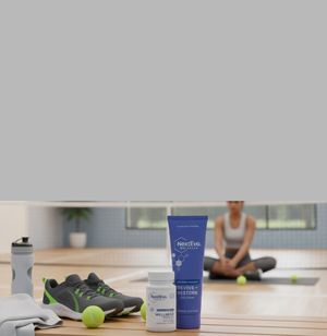 NextEvo Wellness jar and red gummy on table with woman stretching in background CBD For Stress